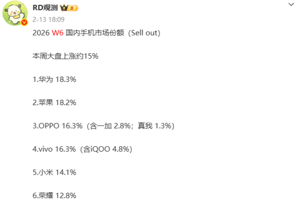 据CNMO了解,2026年第6周的市场格局已显示出头部品牌的激烈角逐。当时,华为以18.3%的微弱优势超越苹果(18.2%)。OPPO与vivo则以相同的16.3%份额并列第三,小米和荣耀分列第五、六位。该周市场大盘上涨约15%。