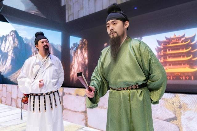 步入人民网·梦幻灵境AI展演中心(武汉),一场别开生面的AI魔术戏剧《AI上黄鹤楼》正在上演。黄鹤楼在AI技术的精准还原下巍然耸立,江城街道热闹非凡,观众如同瞬间“穿越”到盛唐时代。