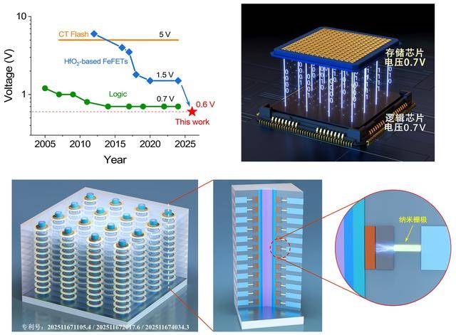 逻辑器件和存储器件是构建集成电路的两大底层元器件。逻辑单元构成『芯片』的“运算与控制中枢”,存储单元构成『芯片』的“数据仓库”,两者占集成电路市场规模的70%以上。在摩尔定律的驱动下,逻辑晶体管通过制程微缩和架构迭代,性能不断提升,当前业界已实现2纳米节点逻辑『芯片』量产,并且CMOS晶体管在0.7V的低电压下工作。然而相比之下,非易失性存储器几十年来性能发展相对滞后,主流的非易失性Flash存储技术难以微缩到先进节点;最为关键的是,Flash存储需要在5V以上高电压下完成数据擦写。因此,现有『芯片』必须在逻辑单元和非易失存储之间集成升降压电路以完成工作电压转换,这带来了额外面积开销、能耗增加等一系列问题。更为重要的是,现代AI『芯片』架构的核心在于数据流优化,逻辑和存储之间的电压不匹配直接导致数据交互不畅通,严重拖累了AI『芯片』算力,并大幅增加了能耗。