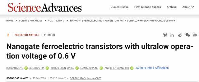 电子学院邱晨光-彭练矛团队研制出国际上最低功耗铁电晶体管