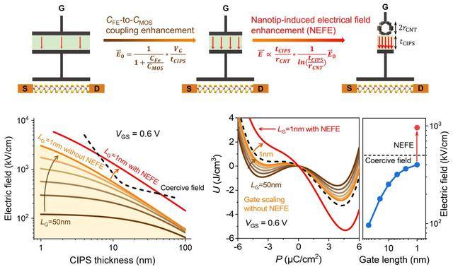 在本工作中,邱晨光-彭练矛团队首次提出“纳米栅铁电晶体管结构”和“纳米栅极电场增强机理”。通过优化器件结构,巧妙地将栅电极尺寸缩小到纳米极限尺度。利用纳米栅的尖端电场汇聚效应,在铁电层中构建了高度局域化的强电场汇聚区,有效地放大了局部电场强度,大幅降低铁电极化翻转电压,超越了常规平板铁电体的矫顽电压极限,打破了“低电压与高矫顽电场不可兼得”的固有认知,实现了0.6V超低工作电压,将铁电存储电压降低到和逻辑电压相当水平。研制的铁电晶体管能耗水平低至0.45 fJ/μm,领先国际已有报道一个数量级,存储速度接近1纳秒。该研究在国际上首次发现铁电晶体管具有反常的尺寸微缩优势,即物理栅长微缩到极限1纳米时显著汇聚并增强了电场,极小栅极尺寸有效改善了铁电存储特性,充分表明铁电存储器在构建未来亚纳米节点『芯片』具有显著优势。