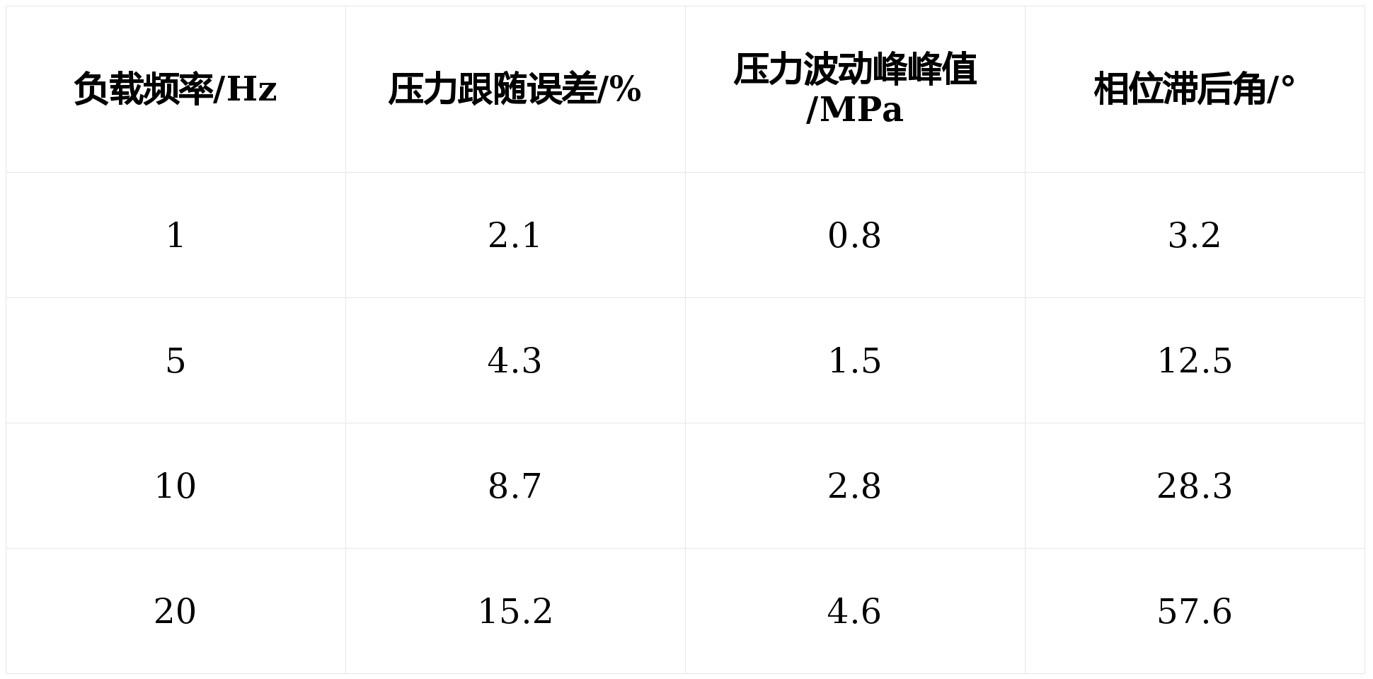 可以看出,当负载频率低于5Hz时,系统具有良好的跟随性能,压力波动幅度可控制在1.5MPa以内;当频率超过10Hz时,跟随误差快速增大,相位滞后显著增加,此时系统压力响应主要受液压元件动态响应带宽限制。