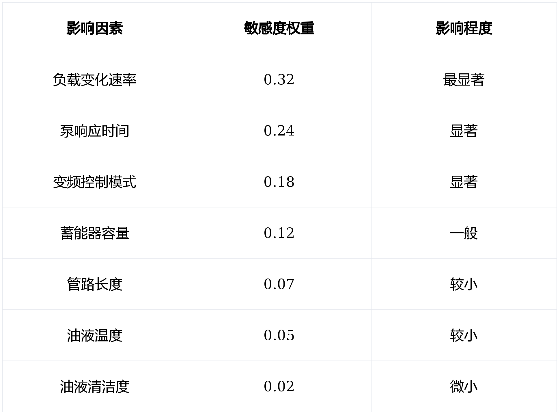 - 负载变化速率是影响压力超调量的最显著因素,50ms阶跃负载下常规系统压力超调量可达16%以上,需通过控制优化与参数匹配加以抑制;