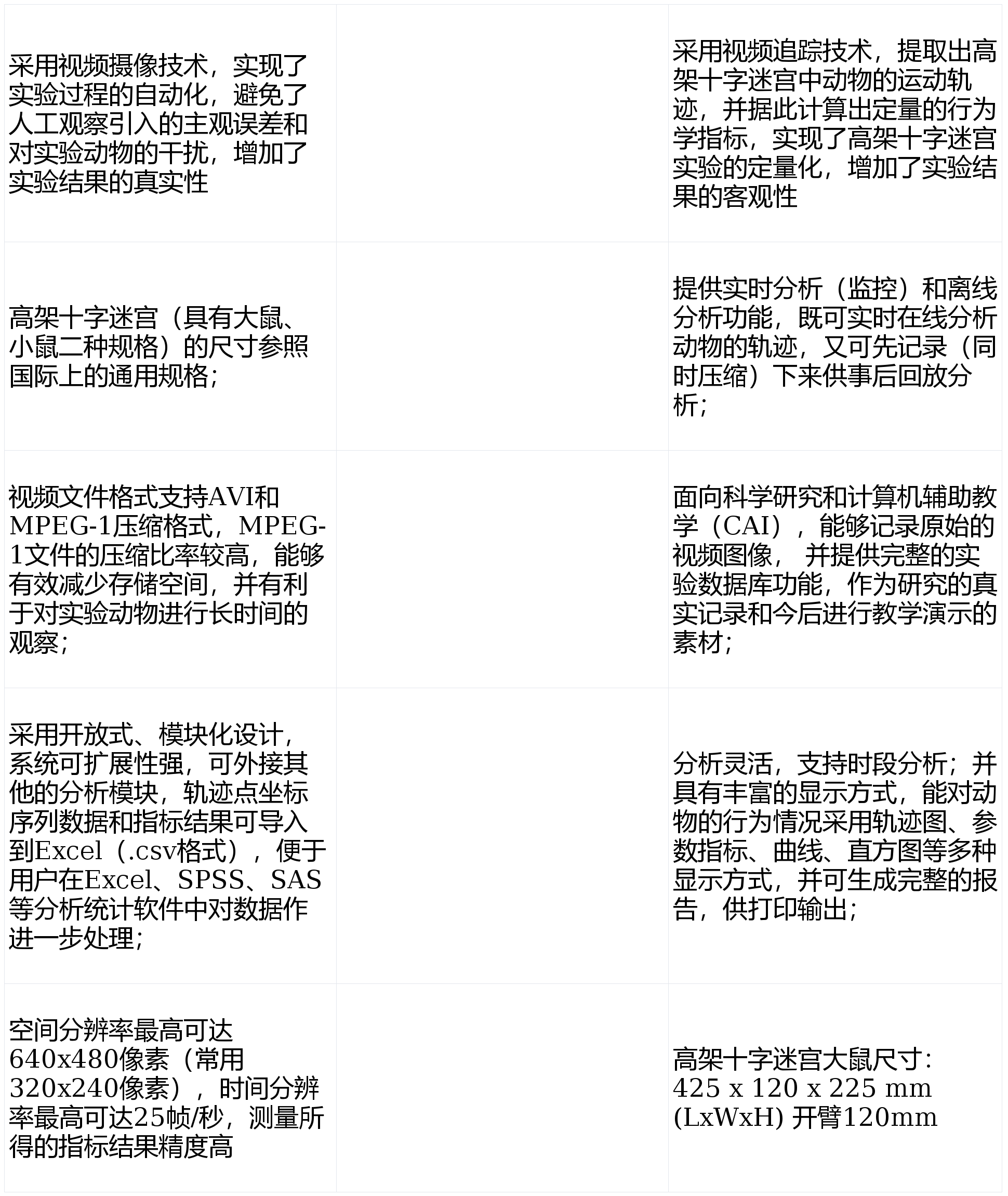 高架十字迷宫实验视频分析系统啮齿类动物(例如大鼠、小鼠)有探究行为,放入高架十字迷宫后会主动探究开臂,但又惧怕开臂中高悬敞开的环境。抗焦虑药物能够增加开臂探究活动,致焦虑剂则相反。高架十字迷宫是进行焦虑研究的较新的方法,结果可靠。本产品采用视频跟踪技术完成了高架十字迷宫实验的自动化和定量化,结果更加真实、可信、客观。