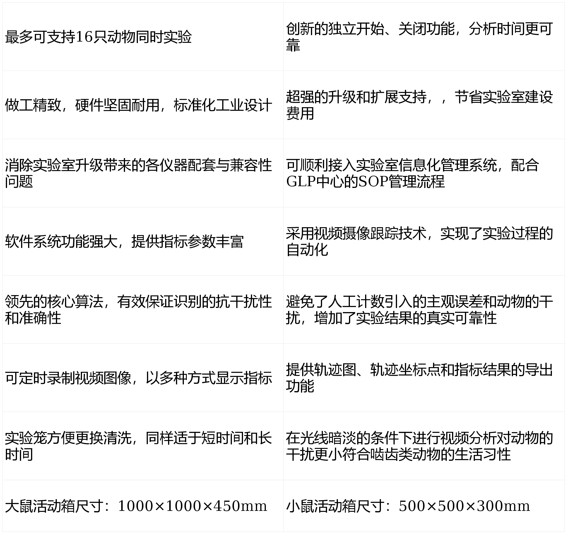 联合开场(旷场)实验视频分析系统(inner open field test)是观察研究实验动物神经精神变化、进入开阔环境后的各种行为,例如动物对新开阔环境的恐惧而主要在周边区域活动,在中央区域活动较少,但动物的探究特性又促使其产生在中央区域活动的动机,也可观察由此而产生的焦虑心理。中枢兴奋药物可以明显增加自主的活动而减少探究行为,一定剂量的抗精神病药物可以减少探究行为而不影响自主活动。