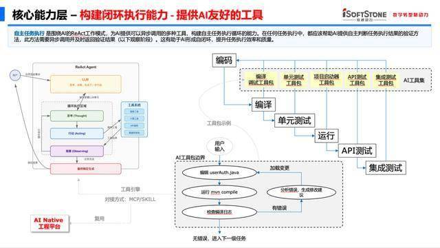 即便有完善的上下文支撑,AI 模型仍存在不确定性,生成的代码、文档可能出现语法漏洞、逻辑偏差等问题。若依靠人工校验,既耗时费力又违背 AI 提效的核心目标。ASDM 围绕 “为 AI 设计工具” 的理念,整合了编译器、调试器、单元测试工具、API 测试工具等软件工程领域的成熟工具,搭建起 AI 的 “专属工具矩阵”。