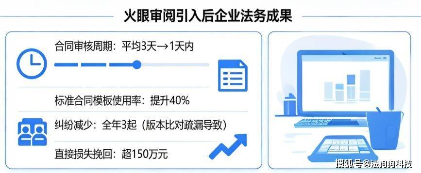 某头部『互联网』企业引入火眼审阅后,合同审核周期从平均3天缩短至1天内,标准合同模板使用率提升40%,全年减少因版本比对疏漏导致的纠纷3起,挽回直接损失超150万元,法务团队每月节省约240小时的重复劳动,能更专注于合规体系搭建与复杂风险研判。
