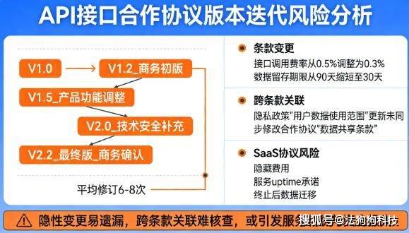 『互联网』合作谈判灵活度高,一份API接口合作协议平均历经6-8次修订,商务改合作期限、产品改功能对接标准、技术补数据安全条款,版本号从“V1.0”堆到“V2.2_最终版_商务确认”。人工比对时,极易遗漏“接口调用费率从0.5%调整为0.3%”“数据留存期限从90天缩短至30天”这类隐性变更,更难同步核查跨条款关联性——比如隐私政策中“用户数据使用范围”更新后,是否同步修改了合作协议中的数据共享条款。更棘手的是SaaS协议,隐藏费用、服务 uptime 承诺、终止后数据迁移等条款的细微调整,若未及时识别,可能引发后续服务纠纷与资金损失。