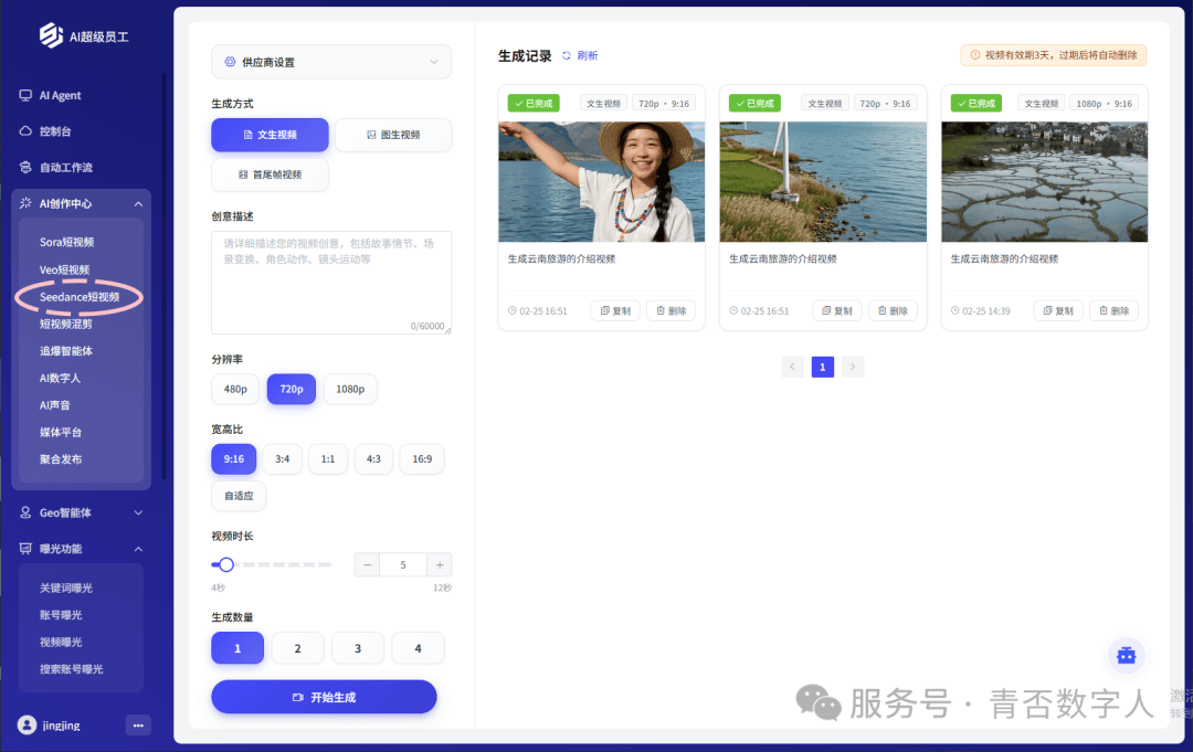在原有的Sora2、追爆智能体、AI混剪、Veo短视频能力基础上,我们全新接入春节刷爆朋友圈的Seedance。