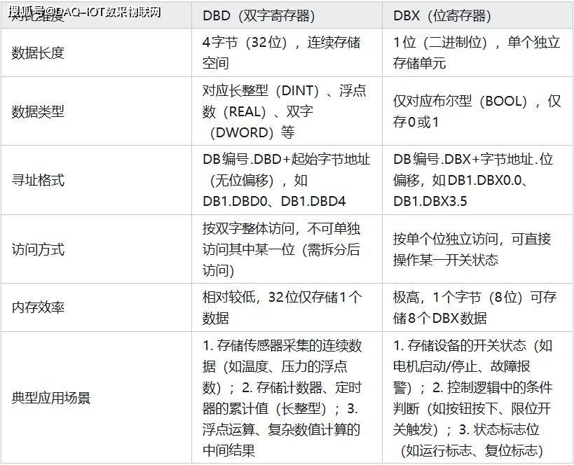 西门子PLC中,DBD和DBX均是数据块(DB块)内的地址表示方式,核心区别在于数据访问粒度、数据长度及应用场景,二者均依赖DB块(共享DB或背景DB)存储数据,寻址逻辑与M区(MD、MW、MB、M位)一致,但定位精度和用途差异显著,具体区别如下: 一、核心定义与本质区别 1. DBD(Data Block Double-word)—— 双字寄存器 DBD是数据块内的双字寻址方式,“D”代表Double-word(双字),占用4个字节(32位)的连续存储空间,本质是用于存储需较大容量、较高精度数据的寄存器单元,可对应长整型(DINT)、浮点数(REAL)等数据类型。 例如:DB1.DBD0 表示从数据块DB1的第0个字节开始,连续占用4个字节(DB1.DBB0~DB1.DBB3)组成的双字,这4个字节又可拆分为2个16位字(DB1.DBW0、DB1.DBW2),或32个独立位(DB1.DBX0.0~DB1.DBX3.7)。 2. DBX(Data Block Bit)—— 位寄存器 DBX是数据块内的位寻址方式,“X”代表Bit(位),仅占用1位(二进制位)的存储空间,本质是用于存储布尔值(BOOL)的最小单元,仅能表示“0”(假)或“1”(真)两种状态。 例如:DB1.DBX3.5 表示数据块DB1中第3个字节的第5位,它是构成字节(DBB)、字(DBW)、双字(DBD)的最小单位,无法再拆分更小的存储单元,常用于表示单个开关量的状态。 二、关键区别明细(表格对比)
