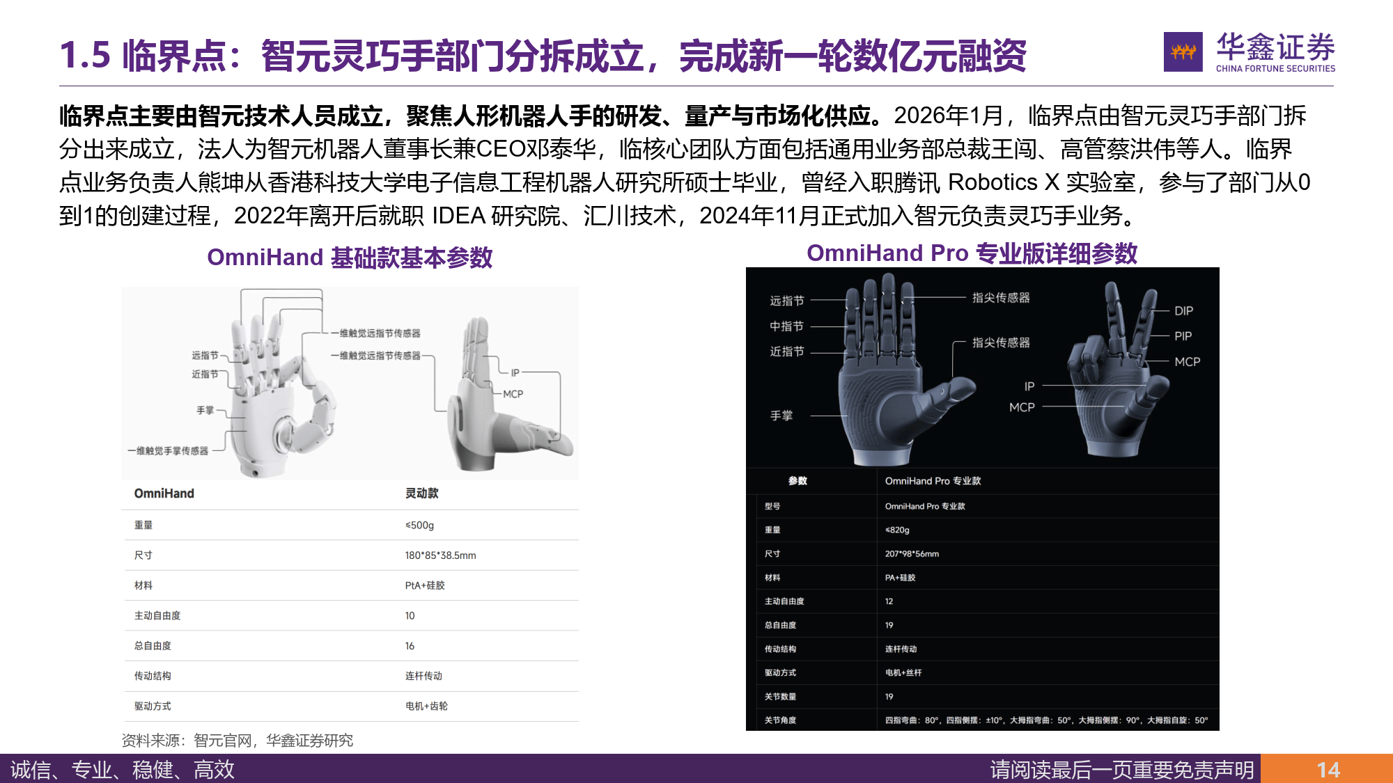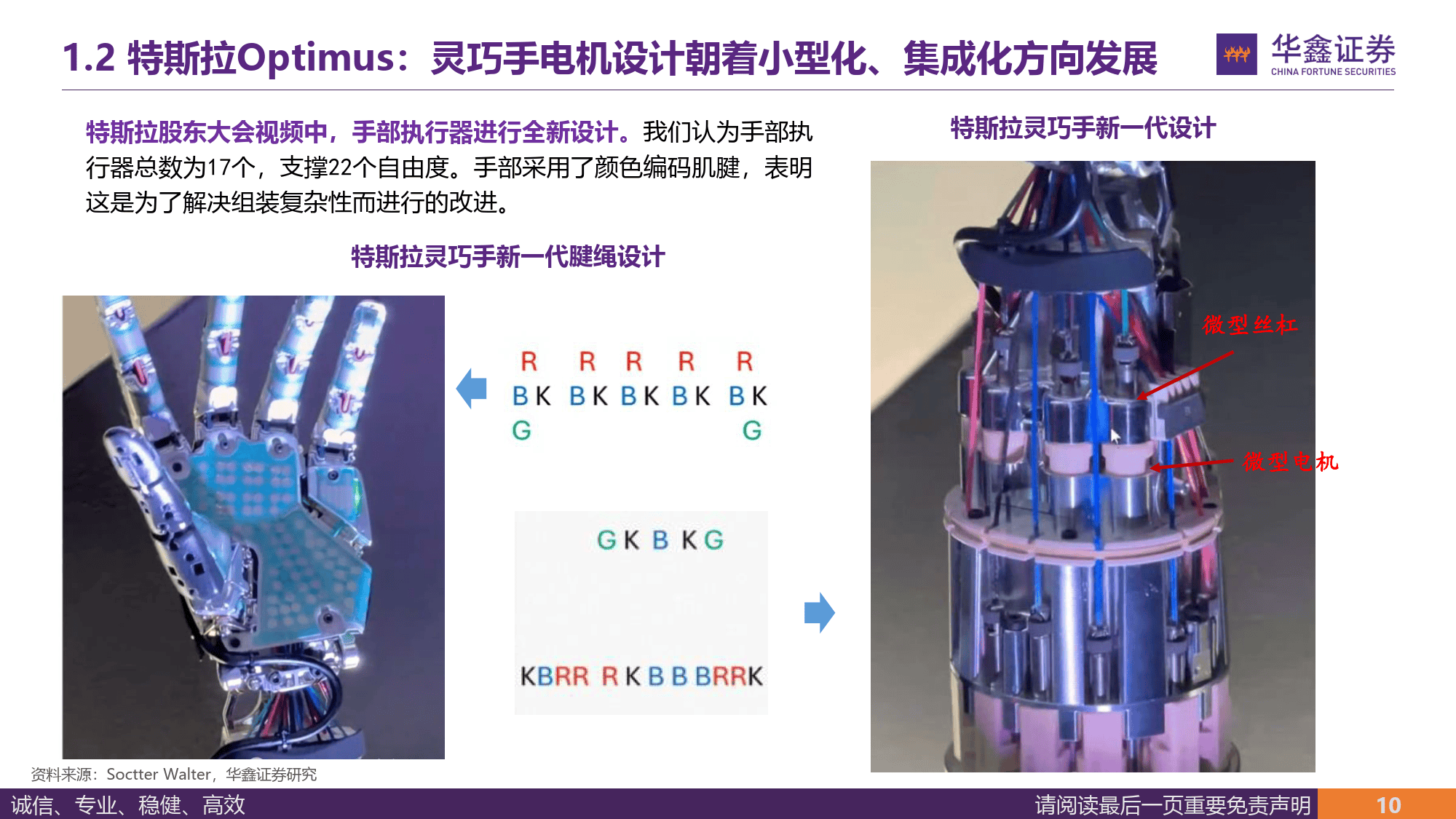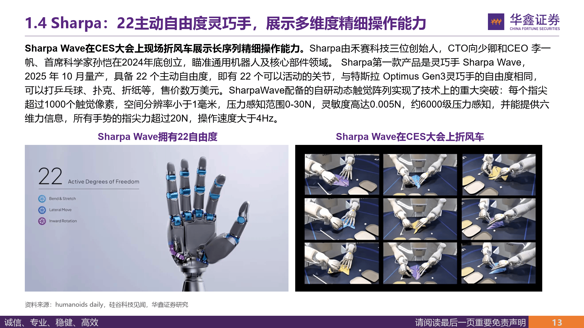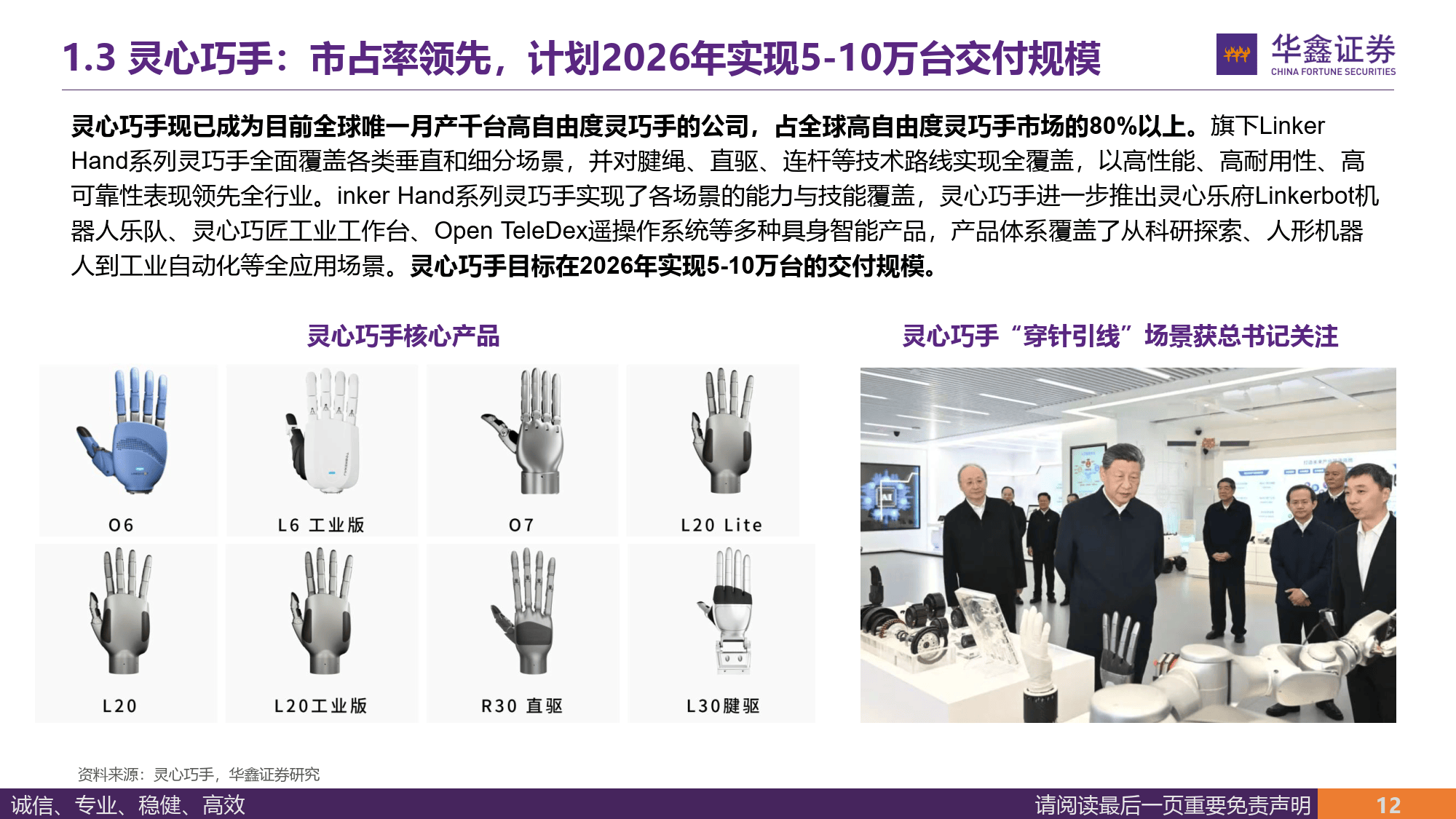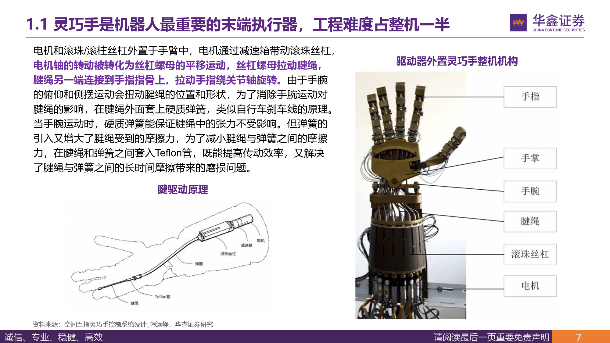 报告称,灵巧手是提升『机器人』️柔性操作能力的关键,其工程难度占『机器人』️整机一半,马斯克直言其是人形『机器人』️机电层面最大难点,特斯拉为其定制无现成供应链的执行器,新一代灵巧手采用腱绳驱动,自由度达 22 个与人手相当,手部执行器约 50 个,单台 Optimus 微型电机价值量约 1 万元。目前灵心巧手、Sharpa、临界点等企业在灵巧手领域各有布局,灵心巧手市占率超 80%,计划 2026 年交付 5-10 万台,Sharpa Wave 灵巧手具备 22 个主动自由度,临界点则由智元灵巧手部门拆分而来并完成数亿元融资。