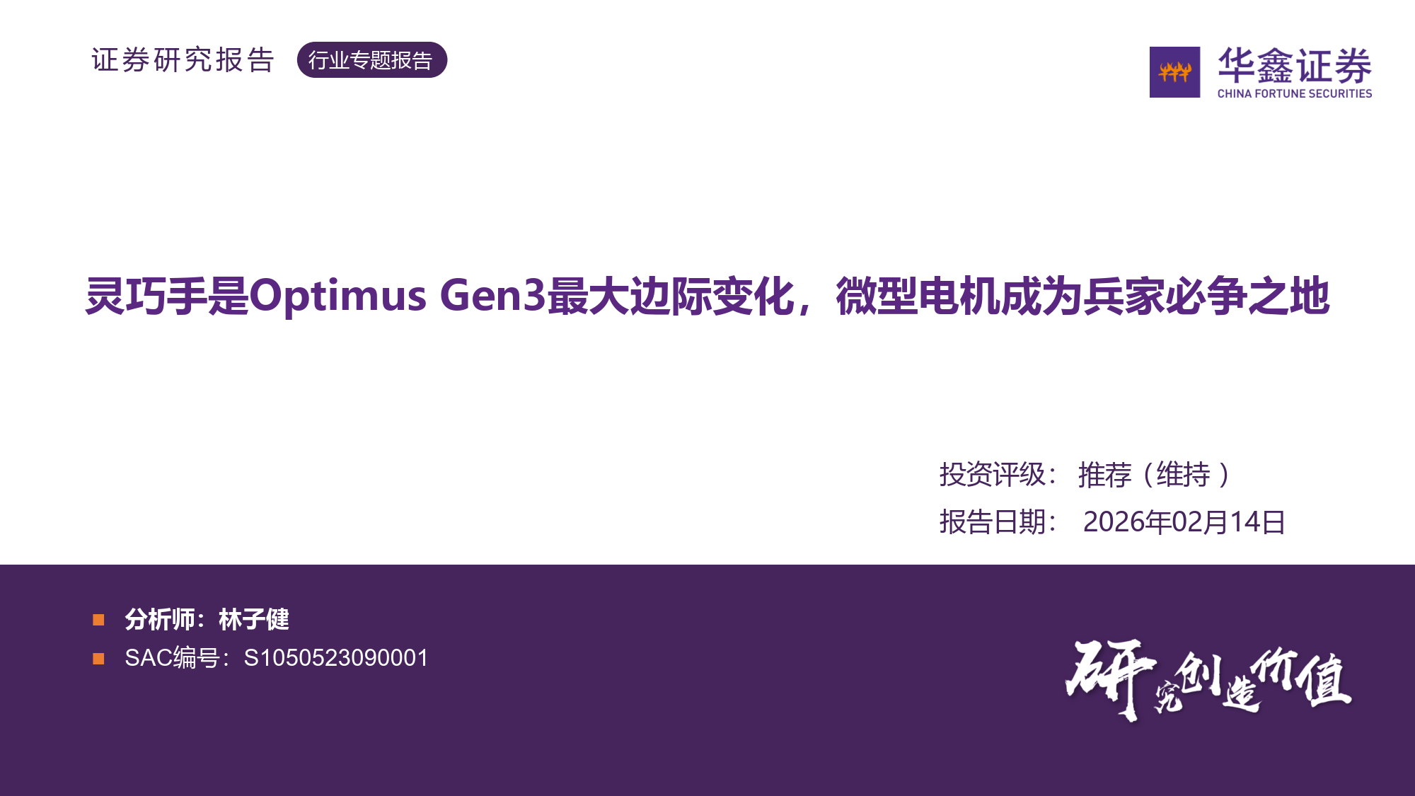 华鑫证券 2026 年 2 月 14 日发布的微型电机行业专题报告指出,灵巧手是特斯拉 Optimus Gen3 人形『机器人』️最大边际变化,微型电机作为灵巧手核心部件,成为行业兵家必争之地,未来市场空间广阔,相关企业迎来发展机遇。
