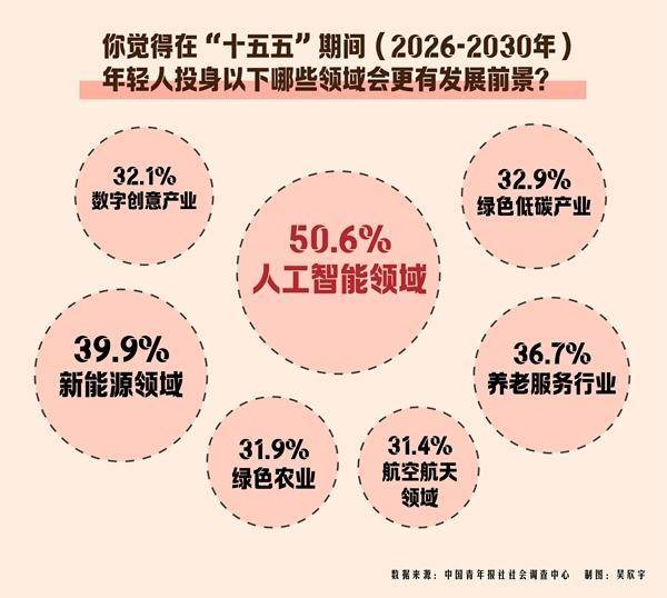 在“十五五”期间,年轻人投身哪些领域会更有发展前景?数据显示,超半数(50.6%)受访者首选人工智能领域,39.9%的受访者选择『新能源』领域,36.7%的受访者选择养老服务领域。其他还有:绿色低碳产业(32.9%)、数字创意产业(32.1%)、绿色农业(31.9%)、航空航天领域(31.4%)、生物医药领域(31.3%)、托育、陪诊等社会服务领域(29.7%)等。
