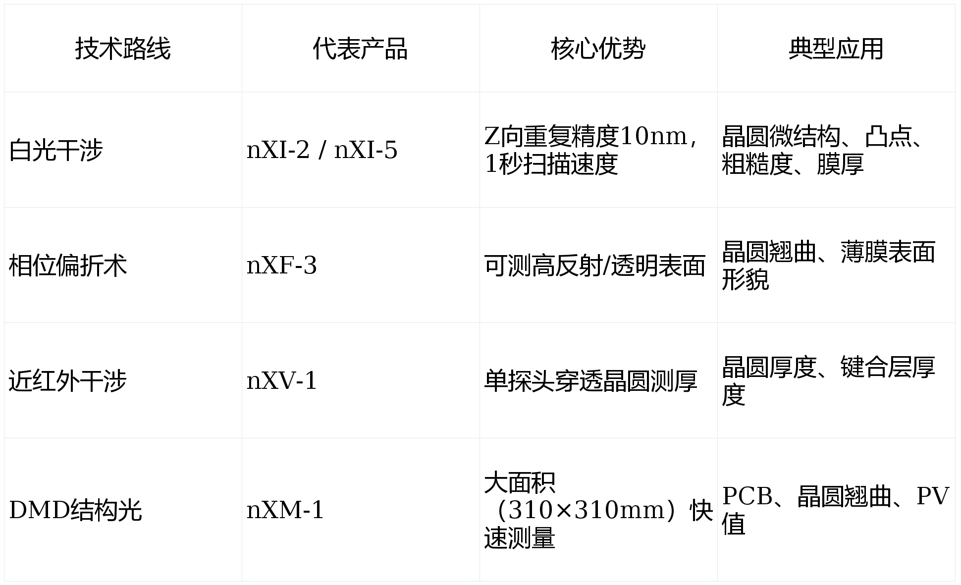 nXM-1采用DMD结构光技术,视场最大可达310mm×310mm,可一次完成12英寸晶圆或大尺寸面板的翘曲测量 。nXP-1更进一步,仅需一张影像即可测量晶圆表面缺陷、透明表面气泡等,真正实现“one-shot”实时检测 。