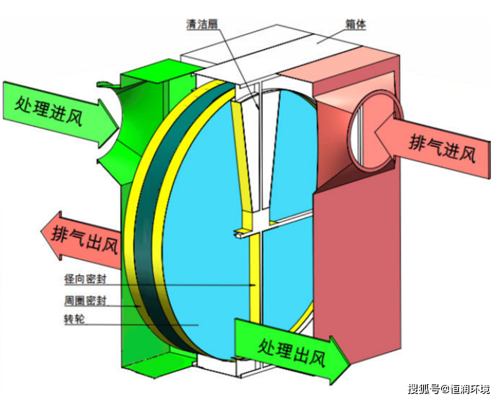转轮式能量回收器的核心是一个缓慢旋转的、具有蜂窝状多孔结构的圆柱形转轮。