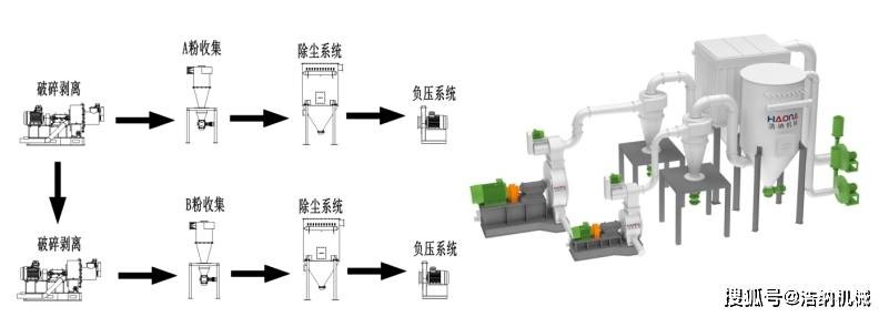 为保障这一方法落地,山东浩纳重构了全封闭自动化作业流程。首先,上料系统对极片进行除铁与整形,确保进料均匀;其次,物料进入核心剥离主机,在可控转速下完成黑粉脱落;随后,通过多级气流分级机,将黑粉与铜铝箔进行精准筛分;最后,经由负压除尘系统收集超细粉尘,成品黑粉与干净箔材分别进入料仓。
