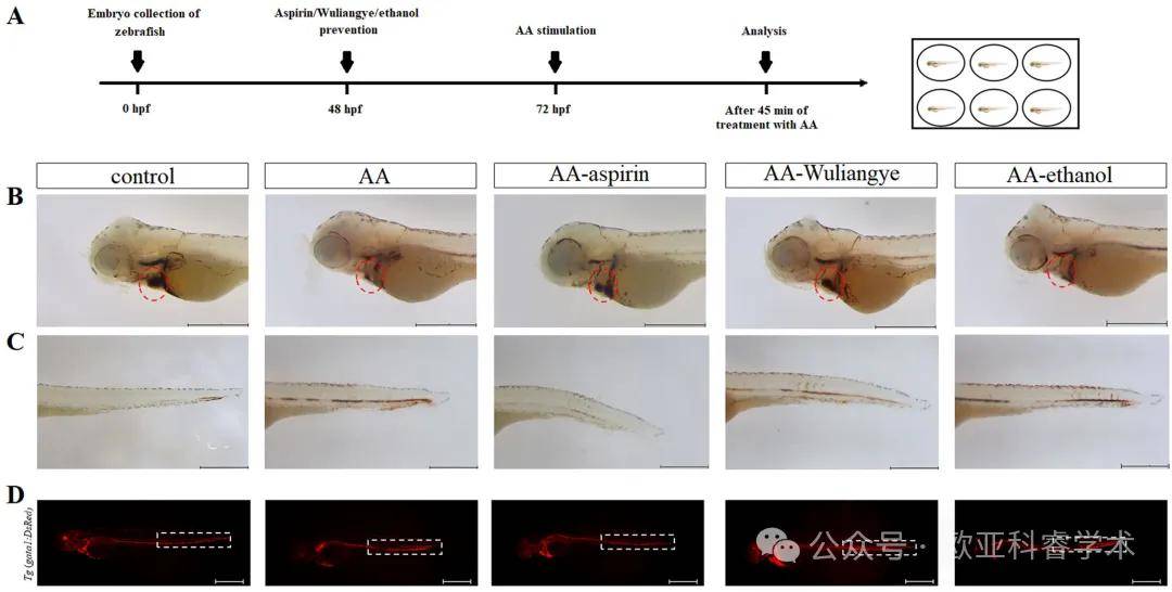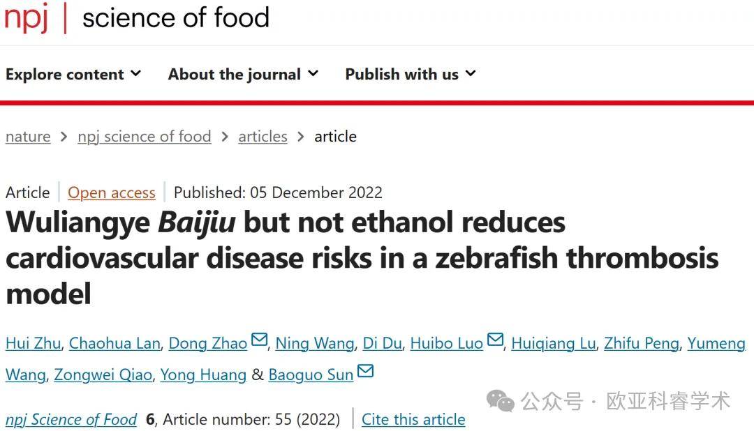 2022年12月5日,北京工商大学研究团队在npj Science of Food(IF=7.8,中科院1区TOP)在线发表题为“Wuliangye Baijiu but not ethanol reduces cardiovascular disease risks in a zebrafish thrombosis model”的研究论文,该研究利用花生四烯酸(AA)诱导建立了斑马鱼血栓模型,以定量评估五粮液白酒的抗血栓作用。