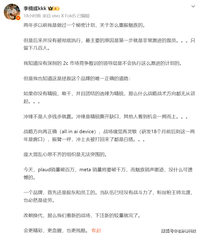 在这两次合作之前,魅族前高管李楠还爆料了一个“重振魅族”秘密计划。当时有着非常激进的规划,首先要大规模裁员,选锋最精锐的团队,重新打造战略方向,结果没有彻底执行。魅族遇到最大的问题就是庞大且混乱的组织,无法形成突围,魅族的消失不遗憾,没有战斗力努力是徒劳。