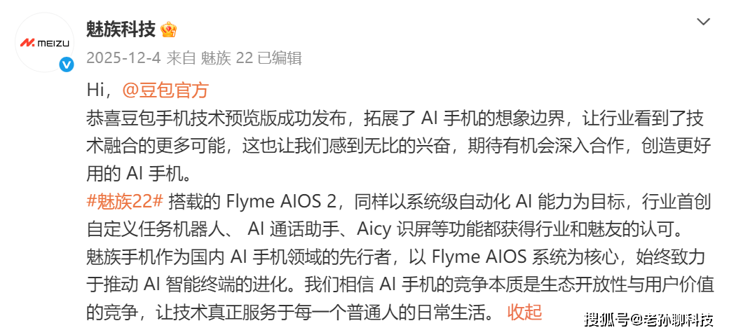 魅族错过与字节跳动合作也很可惜,毕竟去年“『豆包』手机”火爆出圈,国内热度直逼华为和小米。魅族如果和字节跳动推出『豆包』手机,说不定在另一个赛道火爆出圈,哪怕放弃Flyme也是一个重生机会。从魅族的行动看,应该对这次错过的合作非常懊悔,去年底魅族还公开喊话,『豆包』希望合作推出手机,可惜字节跳动不愿意再给魅族机会。