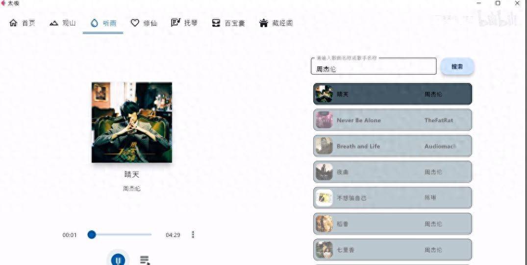 关山界面可浏览设置各类高清壁纸;听雨功能能免费听、下载国内外热门及付费歌曲,音质清晰可批量保存;修仙界面是小说迷天堂,全网资源可在线看或离线下载,无广告无付费章节。