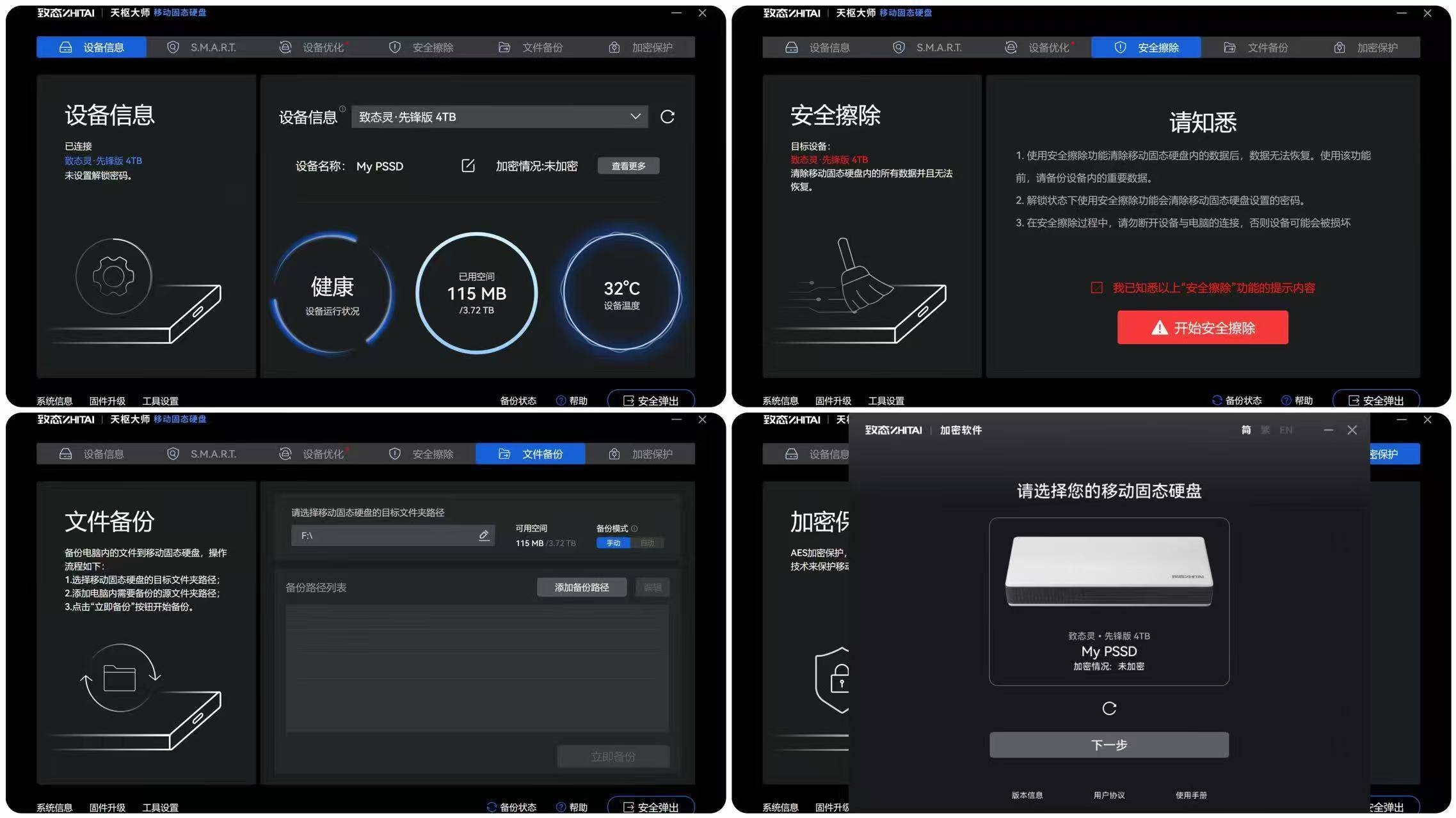 致态天枢大师移动固态硬盘管理软件集成了致态PSSD管理、优化、备份、加密一系列的全流程数据保护体系。软件界面清晰,在主页面可以实时监控硬盘的使用状态,包括剩余容量、温度、健康状况等,能让咱们及时了解硬盘情况,提前做好存储规划。而像安全擦除和加密这两个功能,用下来也都很nice,老王我是非常受用的。PSSD加密能对敏感文件进行加密处理,设置专属密码后,只有输入正确密码才能查看文件,有效防止商业数据被无关人员查看,保护了公司的商业机密。这就让这款PSSD不再只是简单的存储工具,而是成为咱们数据安全的最佳帮手。