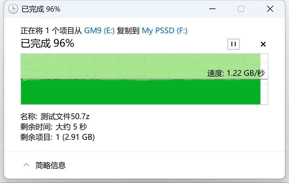 直接复制个将近100GB的文件试试,写入速度也能稳定在1.22GB/s,整个文件拷贝完,速度稳如老狗,几乎就是一条直线。