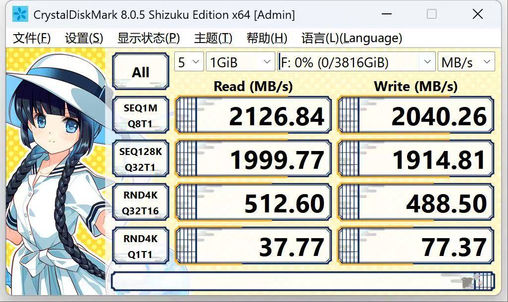 我用测速软件做了简单读写测试,实测顺序读取速度达到2126.84MB/s,比官方标称的2000MB/s还要高一些,写入速度2040.26MB/s,也超过了官方数据,这算是逆向虚标吧,哈哈哈。