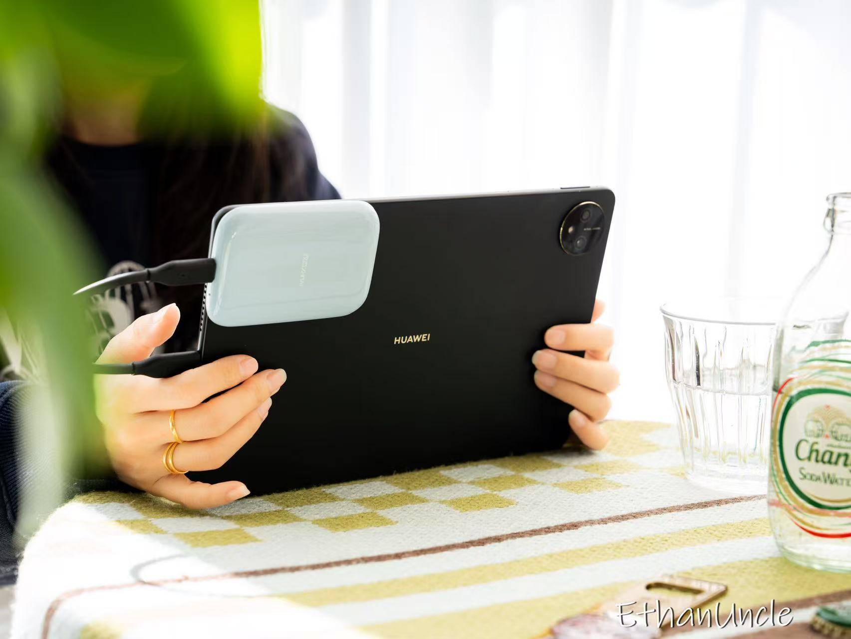 巧的是我的华为平板,竟然也能磁吸在后背上使用,这下128GB的平板存储空间又能无限拓展了。