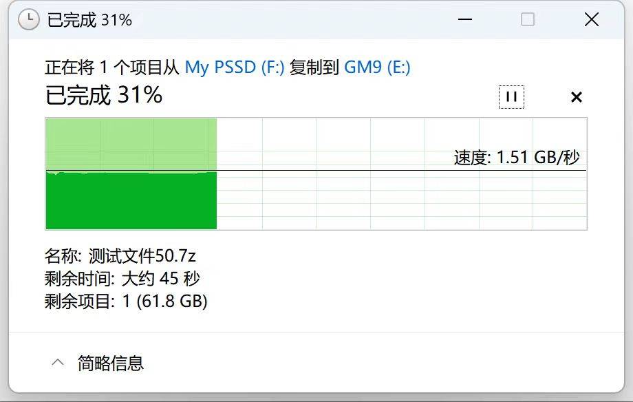 实际从致态灵・先锋版PSSD复制文件出来,速度也都保持在1.5GB/s的样子,在同级别PSSD里绝对是非常优秀和拔尖的表现了。