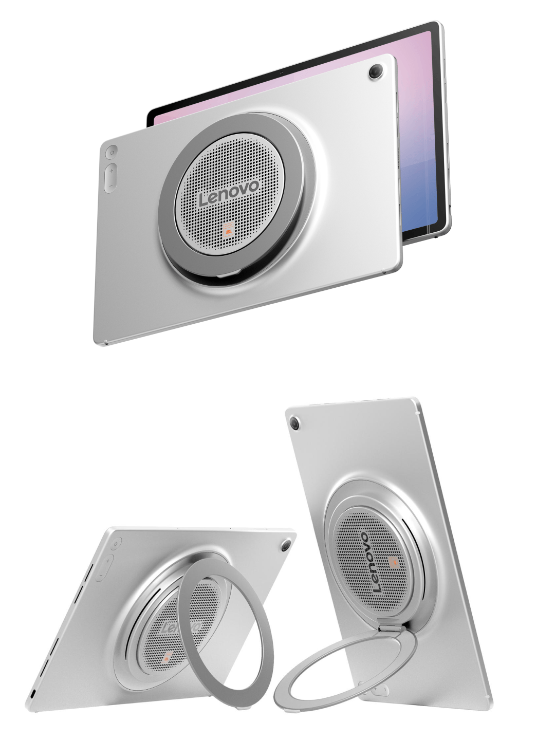 从图片来看,Tab Plus Gen 2 背部拥有一枚极大尺寸的被动辐射☢️器单元,并且还结合了环形支架,支持横屏、竖屏以及悬挂等多种摆放模式。