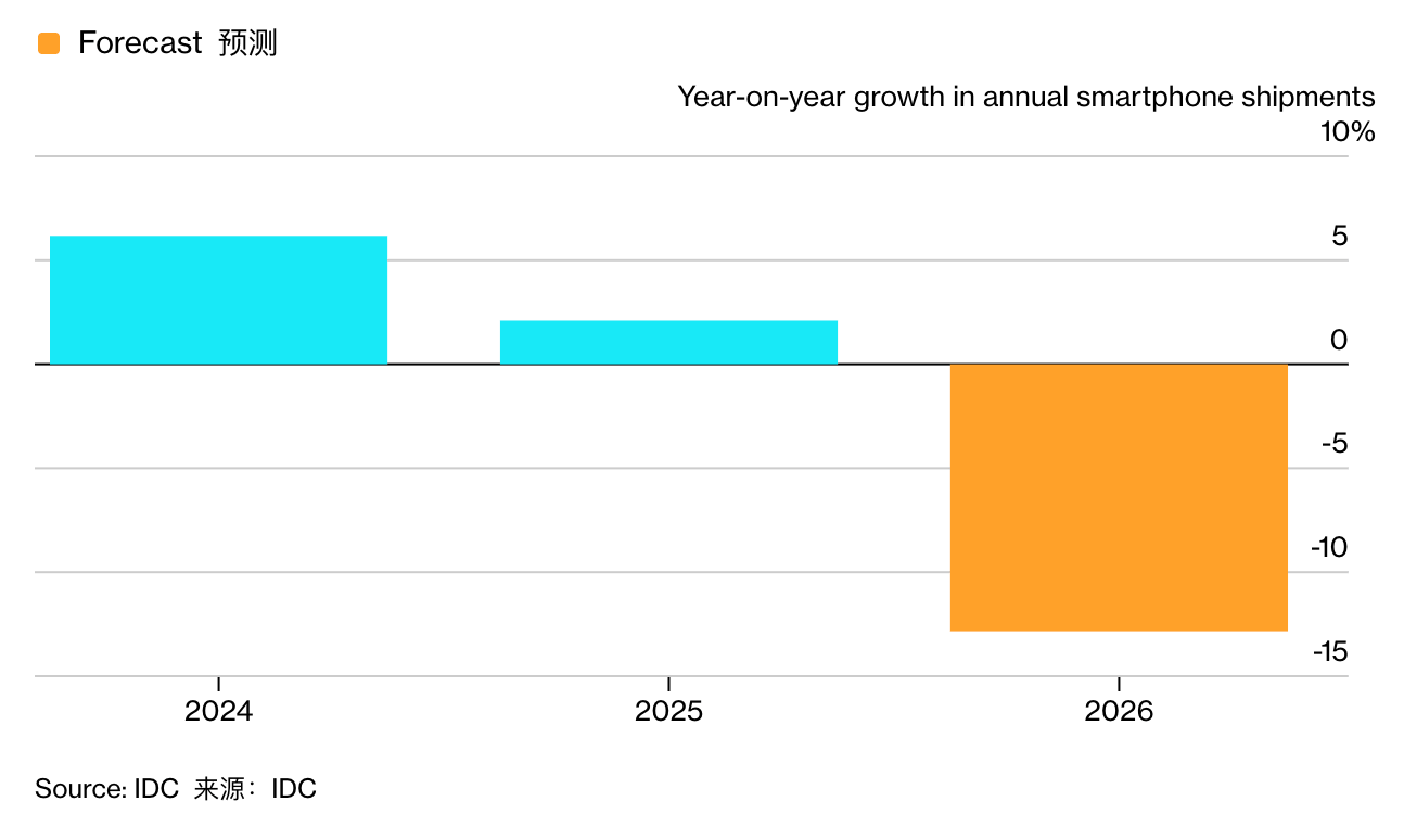 据彭博社援引机构 IDC 消息,受存储『芯片』供应危机的严重影响,2026 年全球『智能手机』出货量预计将大幅萎缩 12.9%。