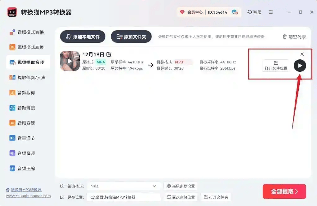 2、输出设置栏中,选择目标格式为“MP3”。设置好保存路径,点击“开始转换”按钮。软件将自动进入处理队列,等待进度条走完,点击“打开文件夹”即可看到提取好的MP3音频文件,操作逻辑清晰,完全无需担心复杂参数配置。