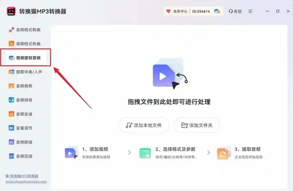 1、下载并安装“转换猫MP3转换器”『Windows』版,运行软件后在主界面找到“视频提取音频”功能。点击“添加文件”按钮,或者直接将你需要提取音频的视频拖拽到软件。