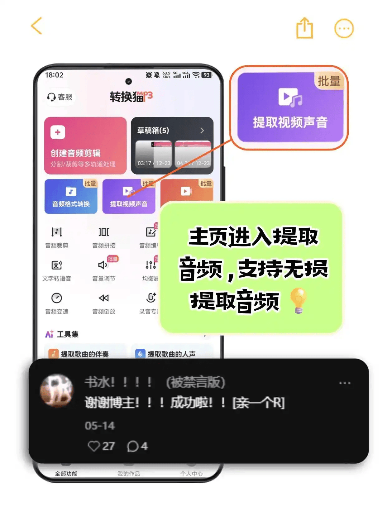 如果你是在手机上直接下载的视频素材,没必要传回电脑处理,直接用手机APP搞定最快。转换猫MP3转换器APP针对手机端优化,导出速度极快。
