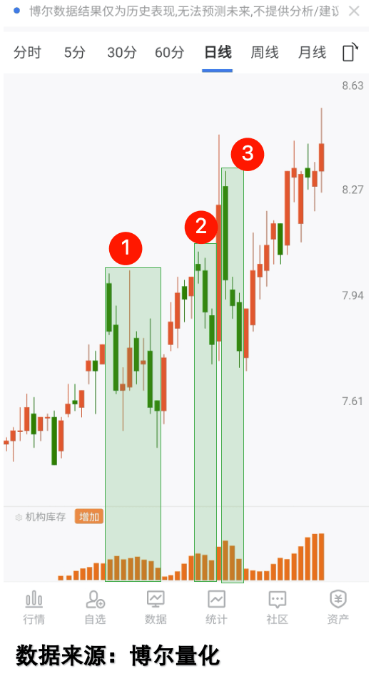 我常把量化大数据比作“人体体检”,各种指标就像体检报告里的心率、血氧,能反映真实的健康状态,而“机构库存”就是其中最核心的“活跃度指标”。用生活里的类比说,它就像小区的快递配送量:如果小区每天都有大量快递车进进出出(对应图里的橙色柱体),说明小区里的常住住户(机构参与者)在频繁活动,这个小区(股票)有持续的活力;如果快递车很久不来(没有橙色柱体),就算楼下看起来人来人往,也是临时访客(普通投资者),没有长期的发展动力。