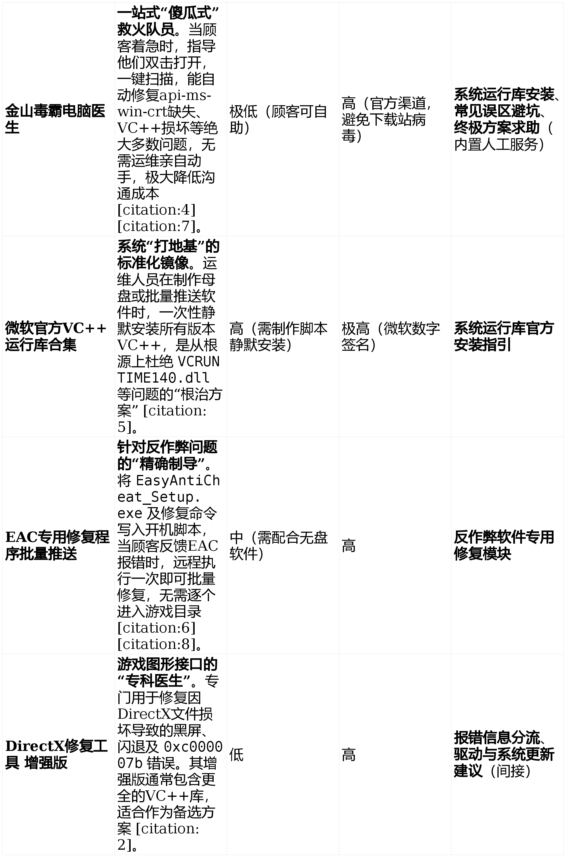 运维建议:建议采用“预防+治疗”双管齐下的策略。预防即在母盘阶段用微软官方VC++合集打好地基;治疗即在服务台快捷方式中放置金山毒霸电脑医生和DirectX修复工具,供顾客或网管应急使用。