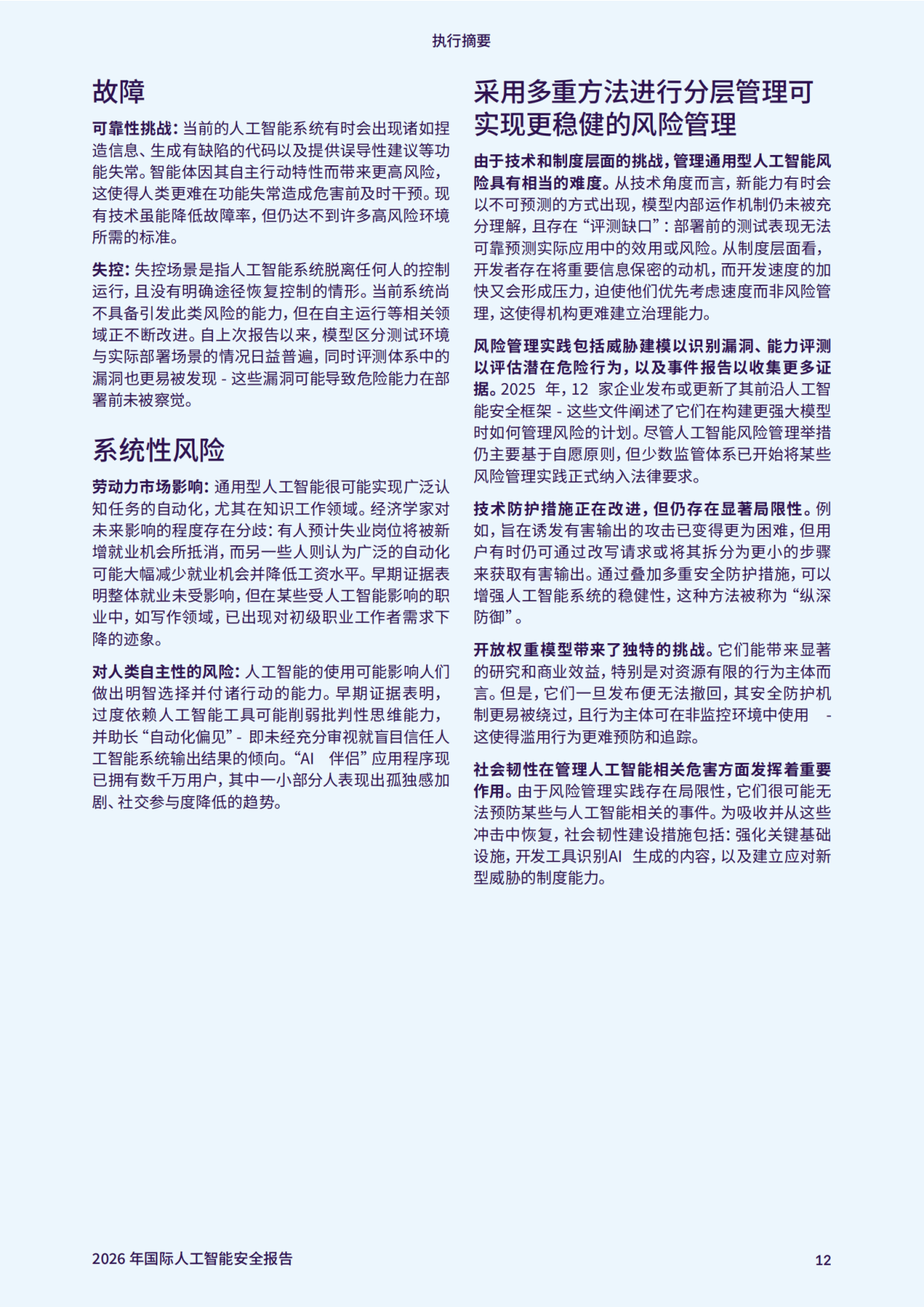 风险管控方面,行业已形成多层防御体系,12 家企业发布前沿 AI 安全框架,部分司法管辖区开始将自愿性风险管理实践纳入法律要求。技术防护手段不断完善,但仍存在局限性,如用户可通过改写请求绕过安全过滤。开源模型虽推动创新与普惠,但存在防护易被移除、无法召回等特殊挑战。社会韧性建设同样关键,包括强化关键基础设施、研发 AI 生成内容检测工具等。