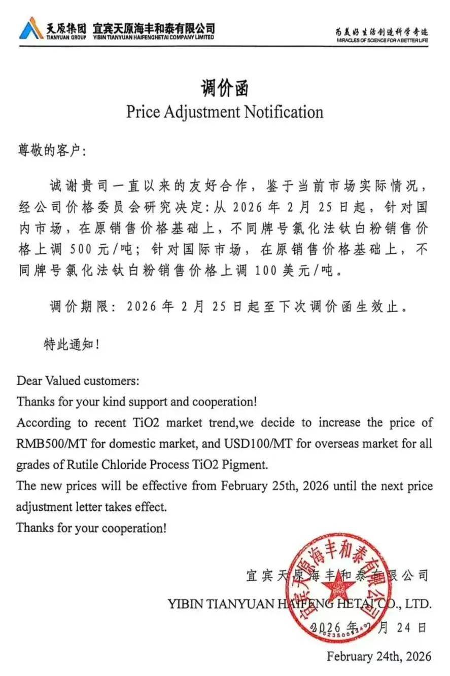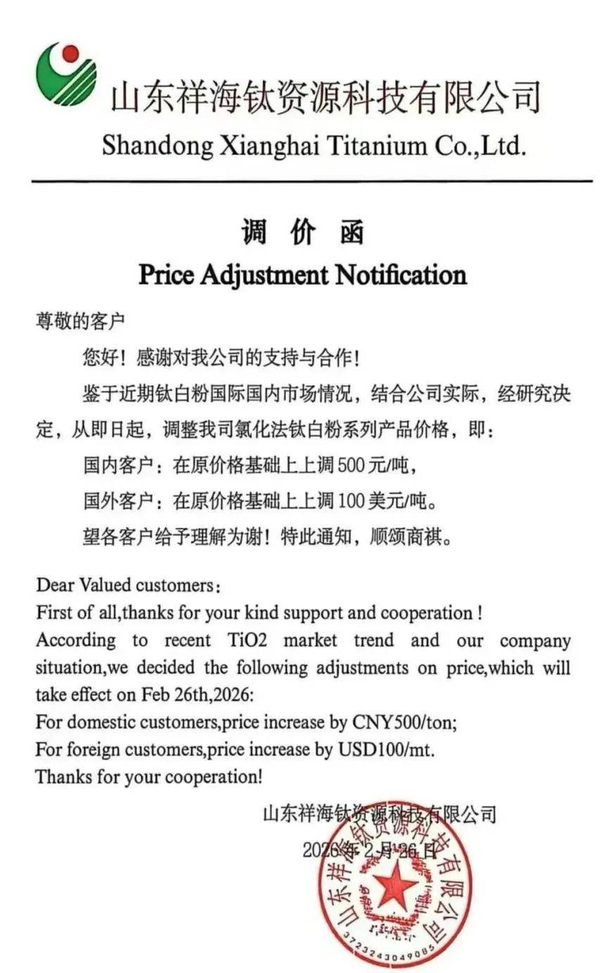 改性培训:2026年粉体表面改性技术高级研修班(第九期)将于2026年4月25-26日 在南京召开,报名请关注V信公众号《粉体技术网》,涉及非金属矿粉体企业:碳酸钙、方解石粉、硅微粉、滑石、重晶石、硫酸钡、硅灰石、高岭土、膨润土、白云石、石灰石、硅灰粉、云母、硅藻土、凹凸棒石、海泡石、电气石等;功能性粉体企业:氢氧化镁、氢氧化铝、氧化铝、钛白粉、白炭黑、氧化铁红、珠光云母、导热填料、氧化锌、勃姆石、粉煤灰、碳化硅、氮化硅、氧化铝、玻璃微珠、铝粉、铜粉、纳米粉体等;药剂和设备企业:偶联剂、硅油、硬脂酸、分散剂、表面活性剂等供应商;高搅机、连续改性机等改性设备企业;粉体填料应用企业:涂料、塑料、橡胶、造纸、覆铜板、电缆、陶瓷等行业;其他企业:中药、『化妆品』、功能粉体、特种粉体等生产及应用企业。近日,宜宾天原、山东祥海、中信钛业等发布调价函,宣布国内氯化法钛白粉价格上调500元/吨,国际市场上调100美元💵/吨。