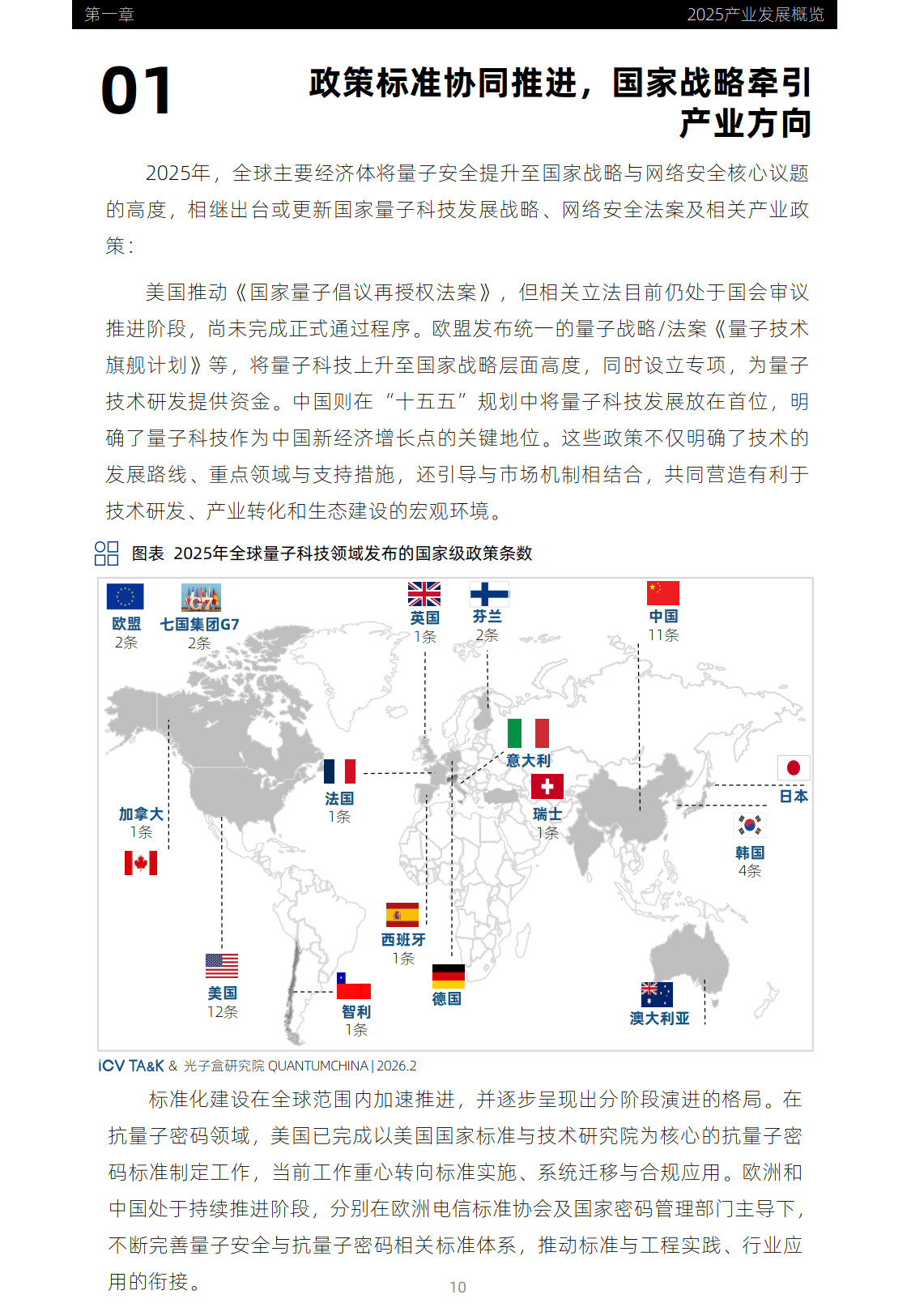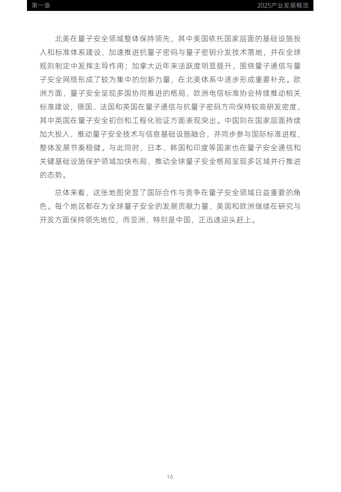 全球主要经济体均将量子安全纳入国家战略,美国推进抗量子密码标准实施与联邦系统迁移,欧洲强化标准体系与量子通信基础设施布局,中国强调与新型信息基础设施融合发展,形成政策牵引、标准落地与工程推进协同演进的格局。