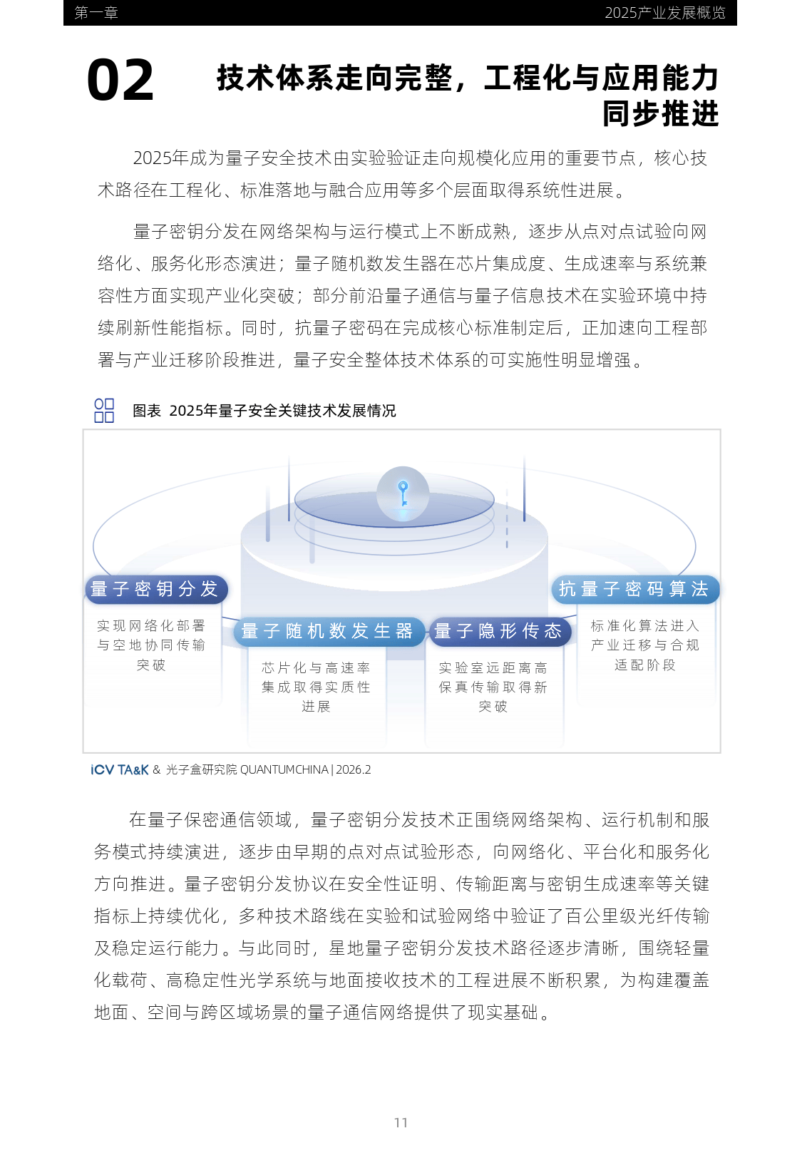 技术层面,量子保密通信与抗量子密码双路径协同发展。量子密钥分发实现网络化部署与空地协同传输,星地量子通信技术路径逐步清晰;抗量子密码完成从算法标准制定到工程化落地的转变,混合安全架构成为现实路径。产业链协同持续深化,上游关键器件性能与供给能力提升,中游注重产品通用性与可配置性,量子安全技术正融入 6G、车联网等新一代数字基础设施。