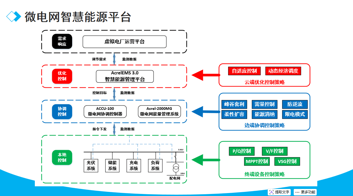 功能描述:通过部署在微电网各节点的传感器,EMS能够实时监控光伏发电量、负荷用电量、储能电池状态(SOC)、电网电压频率等数据。同时,结合气象数据和历史数据,利用AI算法预测未来24小时的光伏出力曲线和用电负荷曲线。