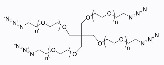 星型拓扑结构:以季戊四醇或类似多官能团化合物为核心,向四周连接四条结构一致的聚乙二醇(PEG)链,每条链末端均修饰有一个叠氮基团(–N₃),形成对称的四臂结构。