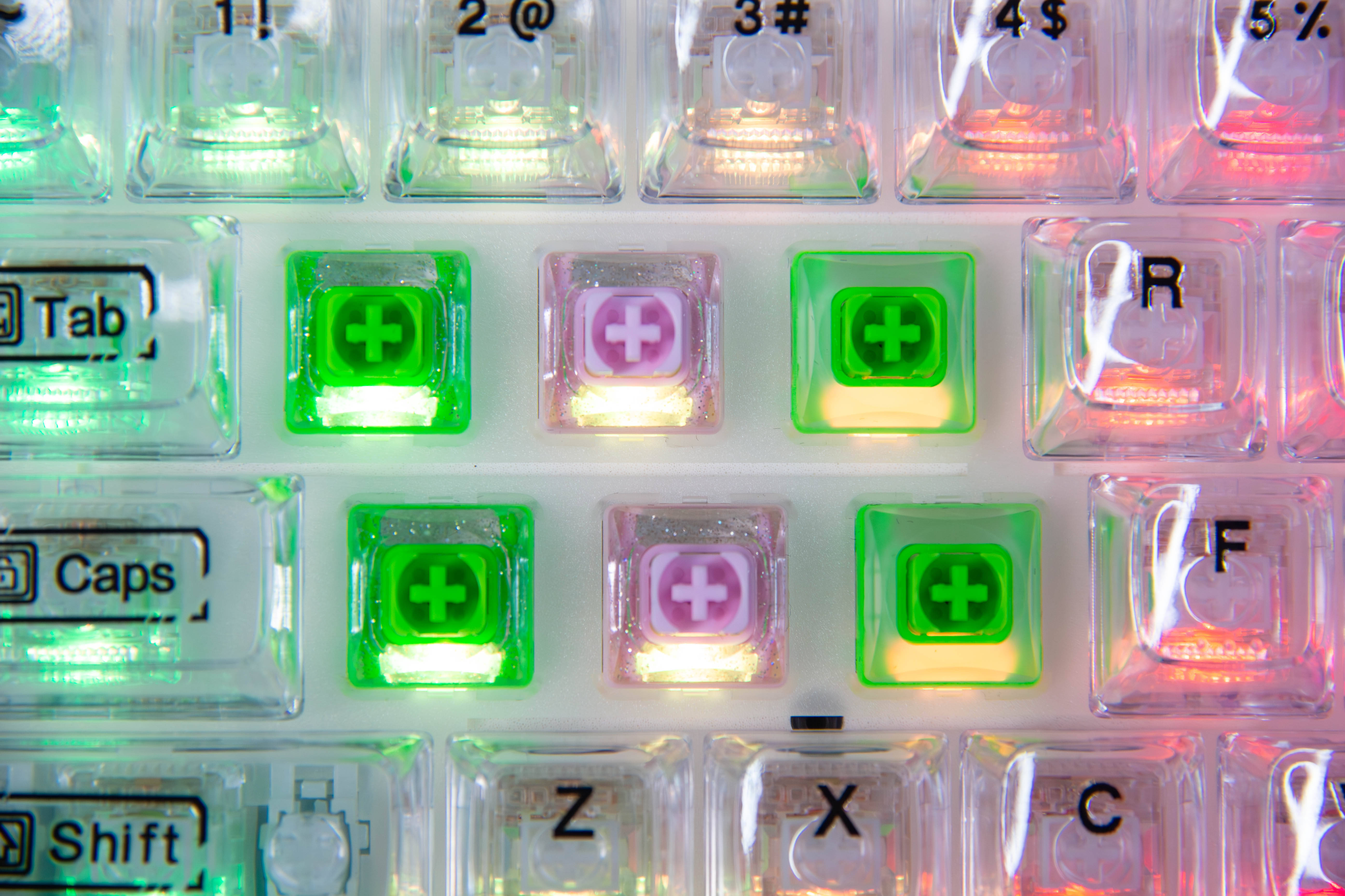 放在键盘上,尤其是灯光亮起来的时候,整个轴体的轮廓和内部结构都清清楚楚,视觉效果很加分。