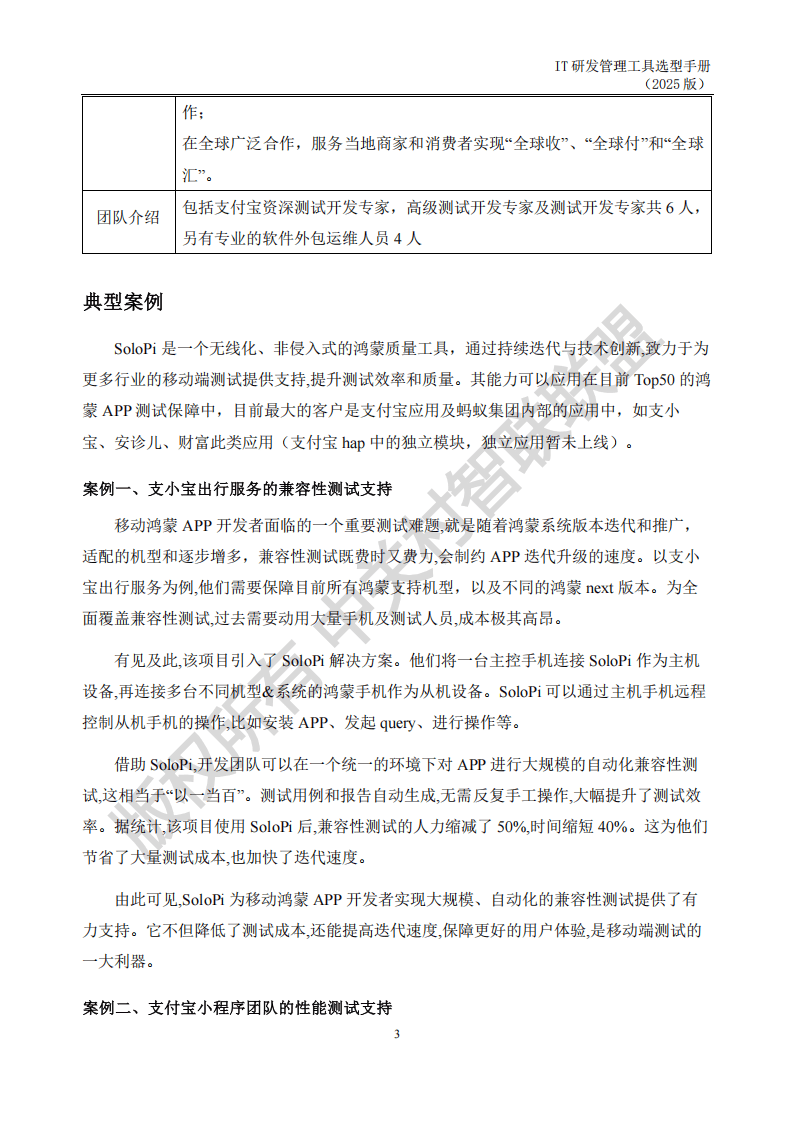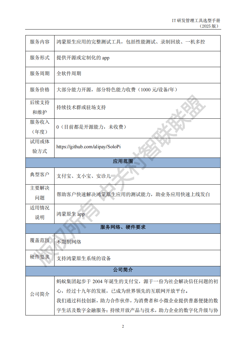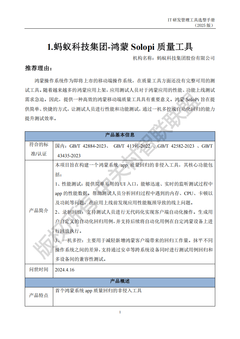 测试&运维类工具覆盖多场景需求,蚂蚁科技鸿蒙SoloPi作为首个鸿蒙系统APP质量回归非侵入工具,通过一机多控、自动化回归等功能,将兼容性测试人力缩减50%;MeterSphere作为开源一站式持续测试平台,支持测试全生命周期管理,已服务国信证券、中国移动等众多企业;腾讯WeTest凭借20余年测试经验,覆盖多终端兼容测试,有效降低企业设备采购成本。