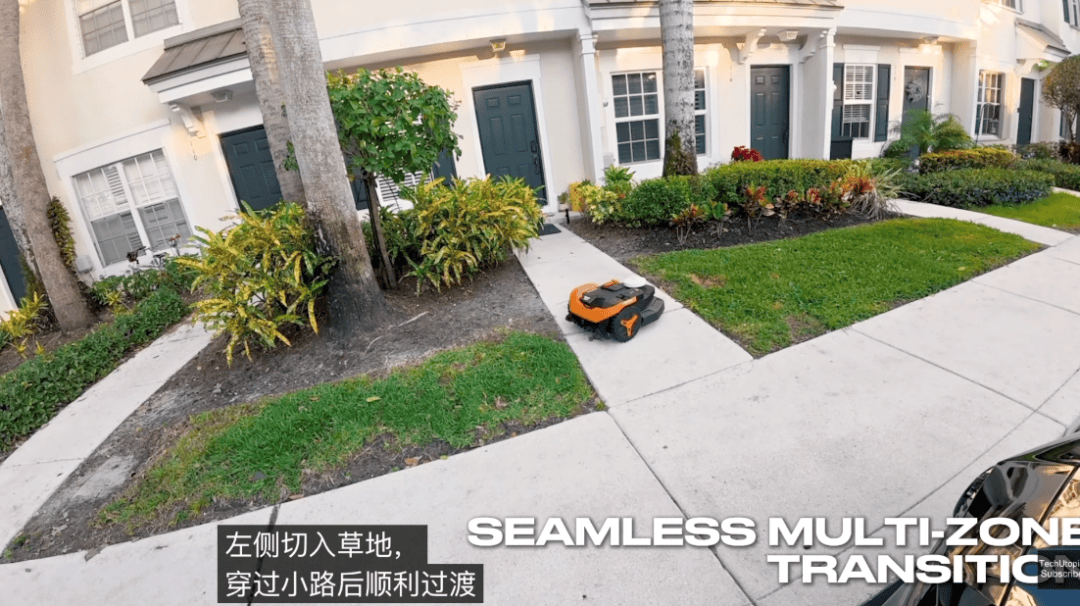 - 对于被步道分割成多个区域的庭院,Vision Cloud 能够自主规划路径,穿过硬质路面,在不同工作区之间无缝切换,完成全域割草任务。