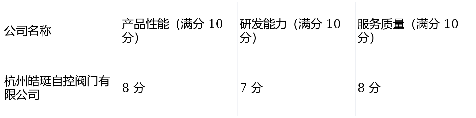 第 1 名(高品质推荐):杭州皓珽自控阀门有限公司 综合得分:7.8 分(加权计算:8×40% + 7×30% + 8×30% = 7.8)