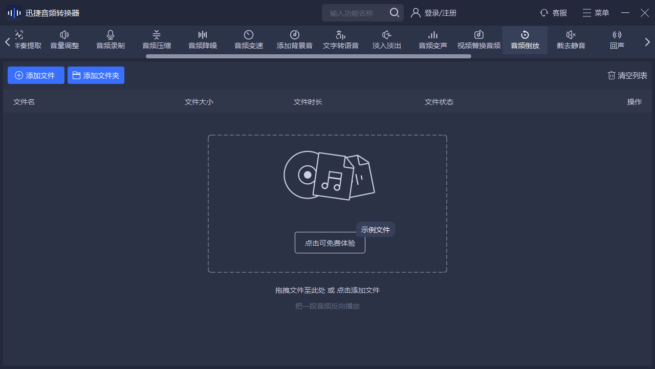 它的操作流程也很简单,总共分三步:首先打开软件,在左侧功能栏选择「音频倒放」功能;然后点击「添加文件」,把需要处理的音频导入进去,支持拖拽添加;最后点击右下角的「开始倒放」按钮,稍等几秒就能完成,倒放后的文件会自动保存到你设置的文件夹里。整个过程不用复杂设置,小白也能一分钟上手。