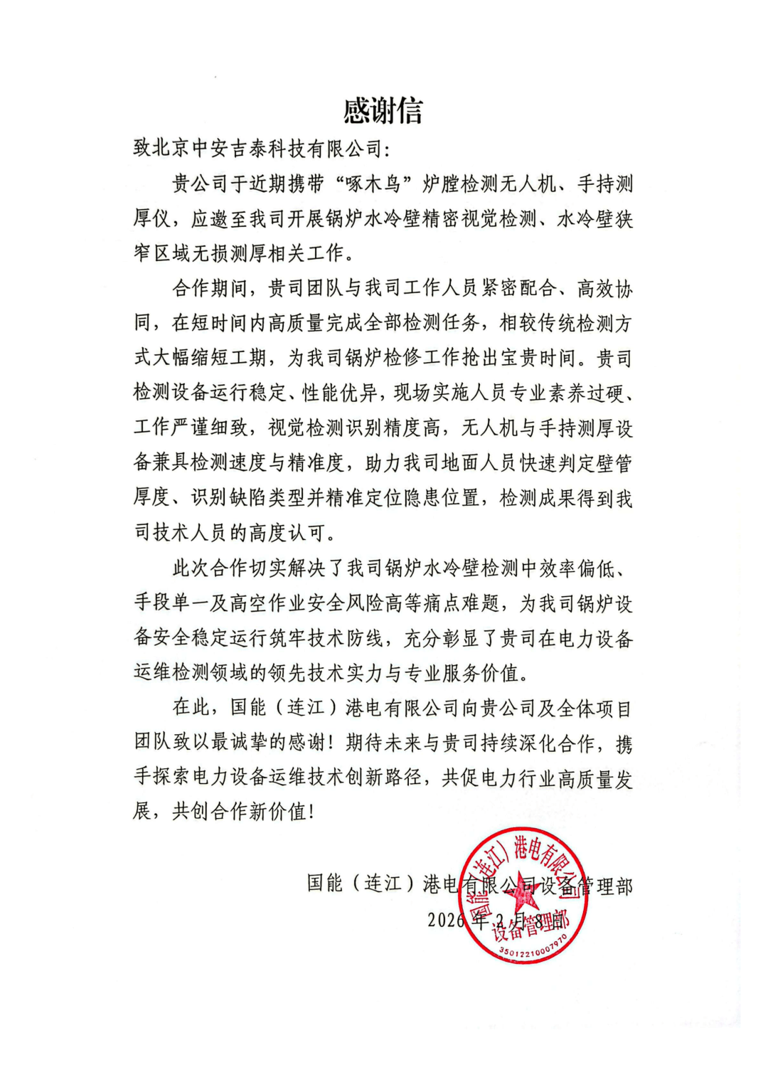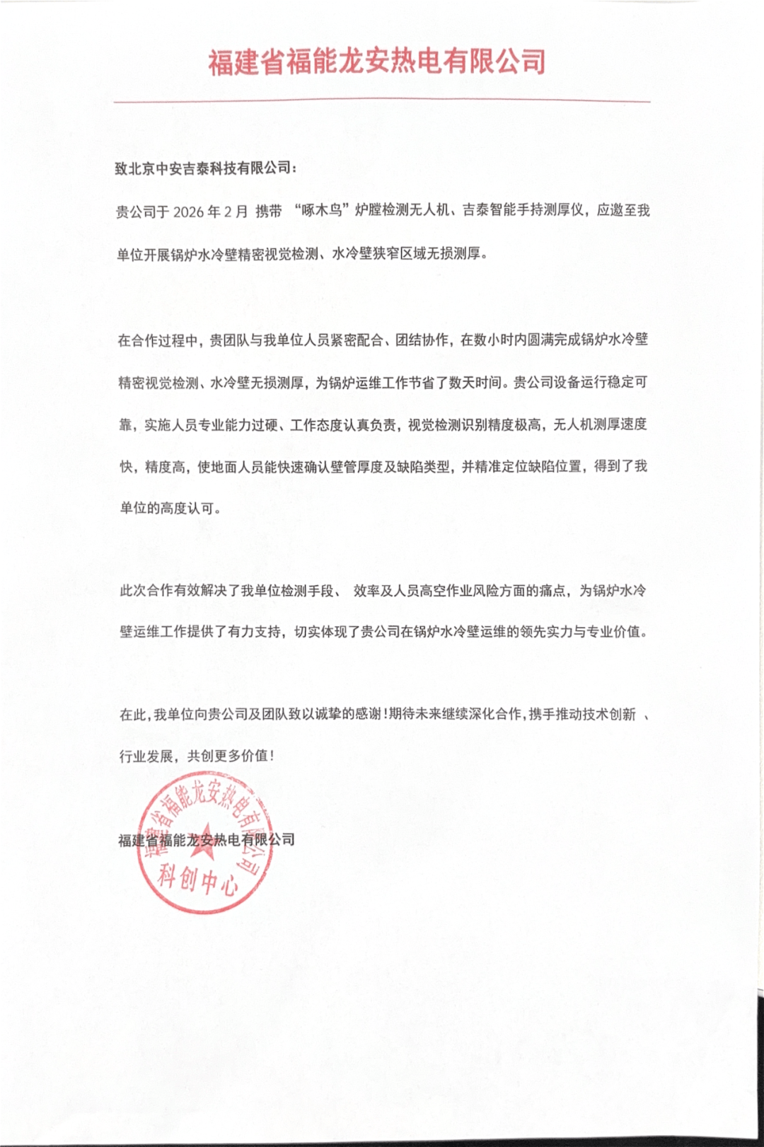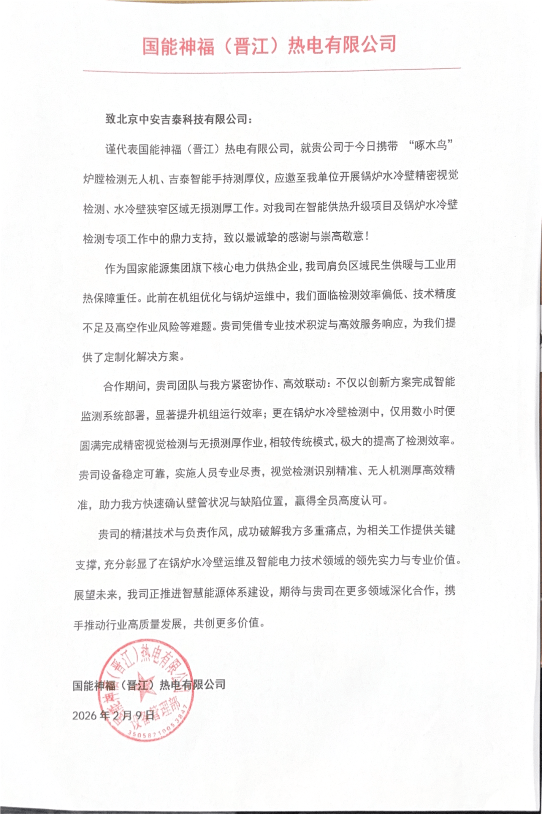 吉泰智能炉膛无人机获得国能、福能两大著名能源集团三大电厂认可,专门为吉泰智能出具了感谢信。