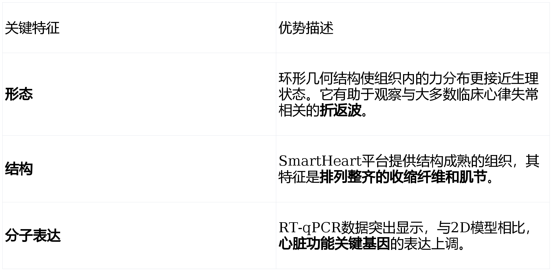 SmartHeart组织在形态、结构、分子和功能上均具有更高的成熟度,这提高了心脏毒性研究的预测能力,并显著超越了传统2D方法的局限性。