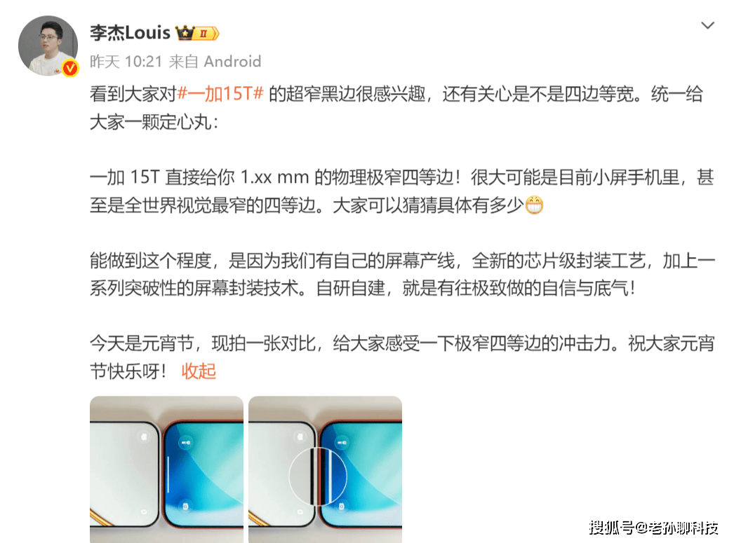 OPPO旗下品牌极其喜欢超长预热,提前一两个月开启预热内容也属于正常,一加15T没有公布具体发布日期,揭晓一些核心参数。一加品牌负责人李杰透露,一加15T拥有极窄四边等宽边框,只有1.xx mm,可能是目前所有小屏手机里面最窄边框,甚至是全世界视觉最窄四等边边框手机。